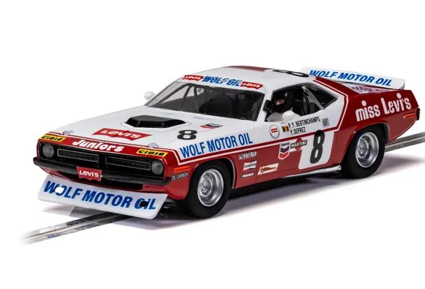 While most associate the big Chrysler Hemicuda with racing across the USA, the car also found some notable success racing in Europe. While Chrysler France raced the car successfully, the model was also found racing in the Spa 24 hours in the early 1970s. This big Levis sponsored machine raced in the 1973 edition. Dwarfing the Ford Capris and BMW CSLs, the big American beast was superbly fast in a straight line but suffered in the swoops and bends of the Spa circuit. However, it did finish a credible 15th overall. Now available from Scalextric this car is a very impressive machine on track, as it powers down the straights and drifts the bends!
