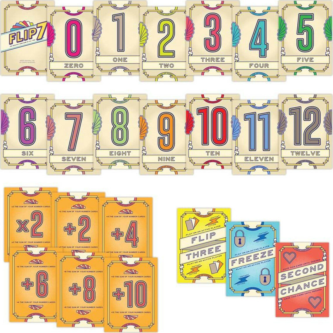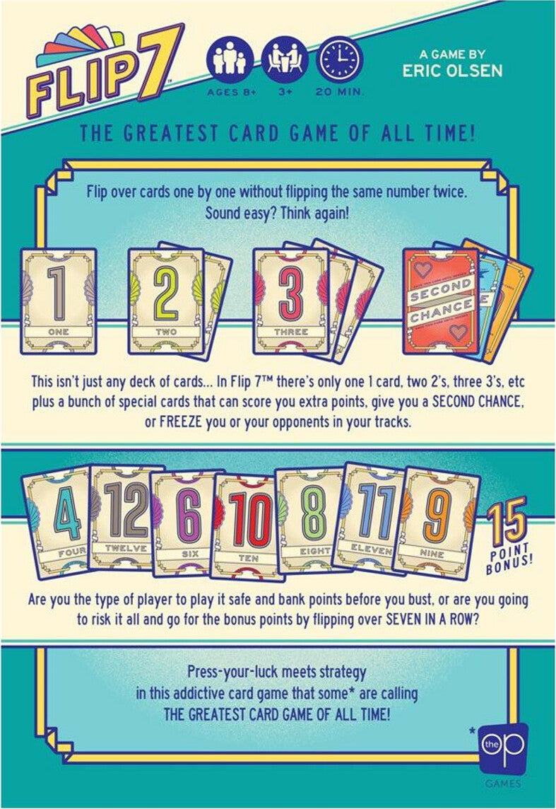 Flip over cards one by one without flipping the same number twice. Sound easy? Think again! This isn't just any deck of cards… In Flip 7™ there's only one 1 card, two 2's, three 3’s, etc. plus a bunch of special cards that can score you extra points, give you a second chance, or freeze you or your opponents in your tracks. Are you the type of player to play it safe and bank points before you bust, or are you going to risk it all and go for the bonus points by flipping over seven in a row? Press your luck meets strategy in this addictive card game that's sure to be the greatest card game you’ve ever played!