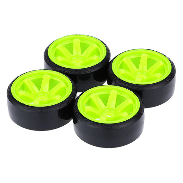 All hard plastic Drift Rim Tire Set. Comes with 4 Drift tires that are interchangeable with the two tone tire sets and the other drift tire sets (flat or lines or side curve). 3.9 oz 2.3"x1"