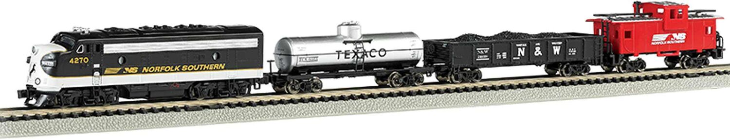 This is the Bachmann N Scale The Stallion Train Set. Galloping down the rails, The Stallion shows off its sleek lines as it races to the finish line. This spirited steed will be the champion of your N scale stable!