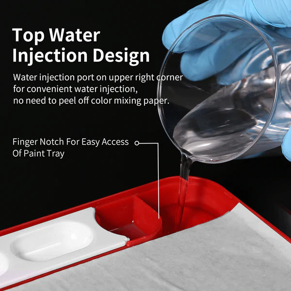Water injection port on upper right corner for convenient water injection, no need to peel off color mixing paper.
