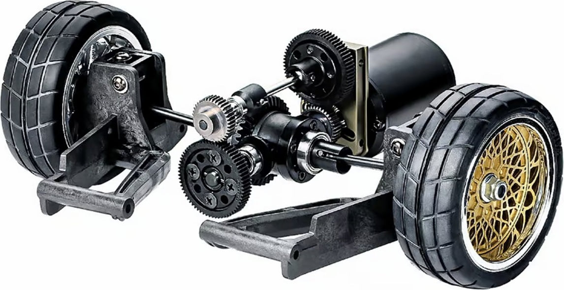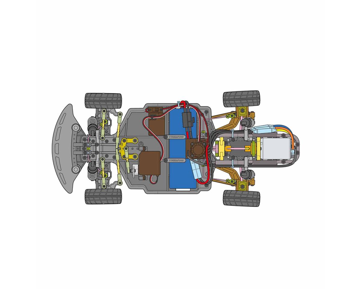 This model uses Tamiya's Bespoke two-wheel drive chassis with a shaft-driven system and a short wheelbase for responsive handling. The chassis incorporates a rigid frame that positions the battery and rear gearbox rearward for heavy rear weight distribution. Double wishbone suspension with CVA oil dampers and full bearings throughout helps ensure stable and smooth on-road performance.