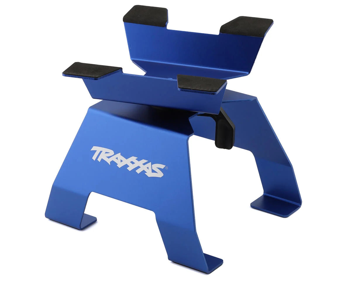 Traxxas® Aluminum X-Truck™ Stand. This stand is a versatile and durable addition to your vehicle maintenance setup. This stand is anodized with a brilliant finish for a sleek and professional look that also contributes to corrosion resistance, adding to the dependable durability that Traxxas offers. The stand swivels a full 360° on dual ball bearings, providing smooth and precise rotation. Equipped with non-slip foam pads on the top and bottom, this stand features a handy locking lever that secures your vehicle in one of sixteen different positions for ultimate stability during maintenance.