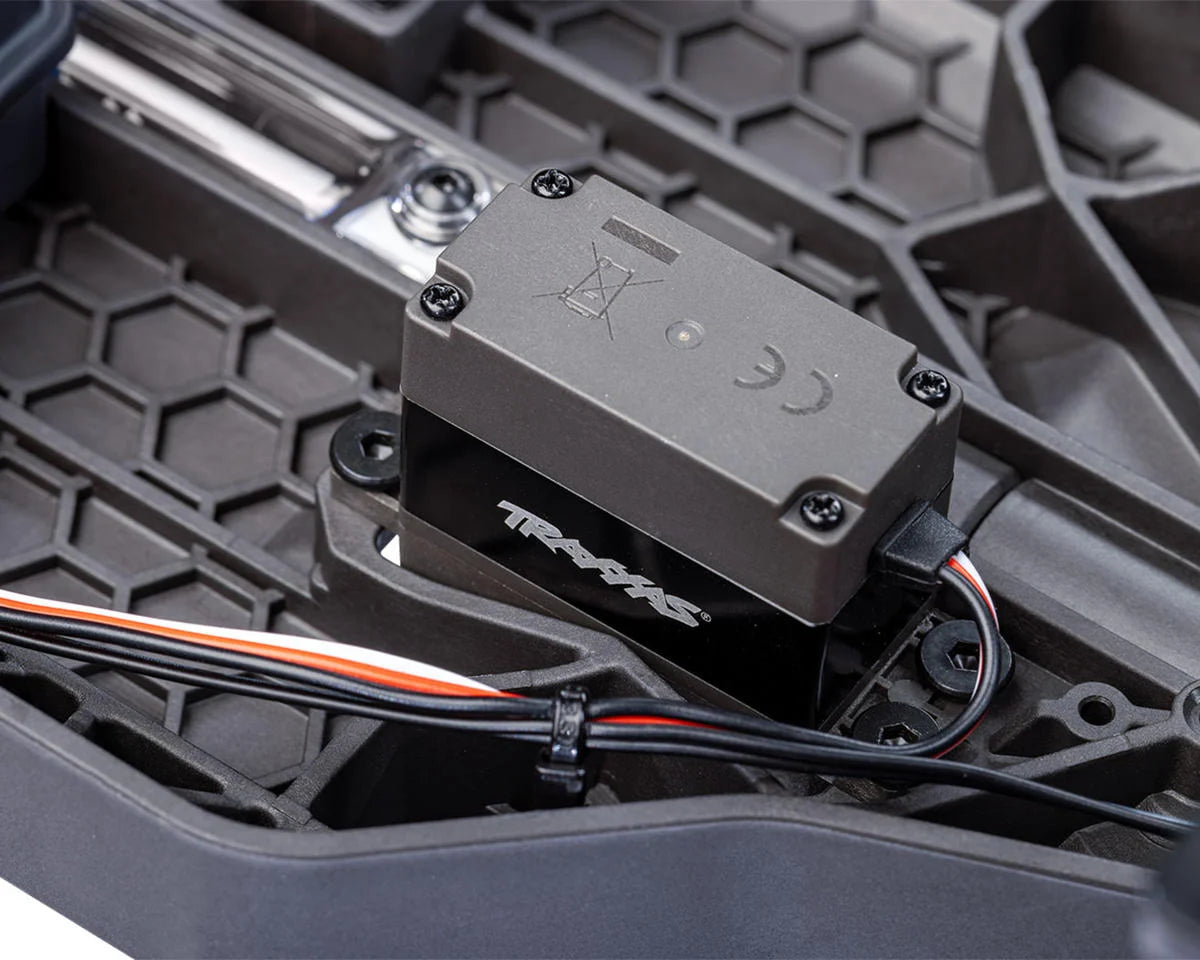 The extended modular chassis tub design delivers high durability with reinforced heavy-duty shock towers, nerf bars for side protection, and a secure battery latch system. Integrated Traxxas Stability Management® and factory-installed telemetry sensors deliver precision control, real-time data, and customizable performance through the TQi™ 2.4GHz radio and Traxxas Link™.