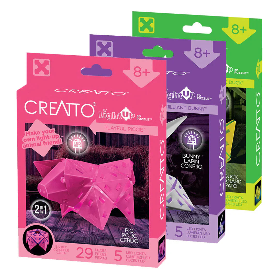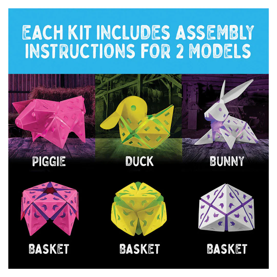 Creatto is a simple yet versatile building system that consists of just two primary components that can be woven together into countless 3D creations. The flexible yet durable plastic tiles interlock quickly and easily for all skill levels; no additional materials or hardware required!  Three designs available, Playful Piggie, Dazzling Ducky, and Brilliant Bunny.  Each purchase includes one Barnyard Buddy.