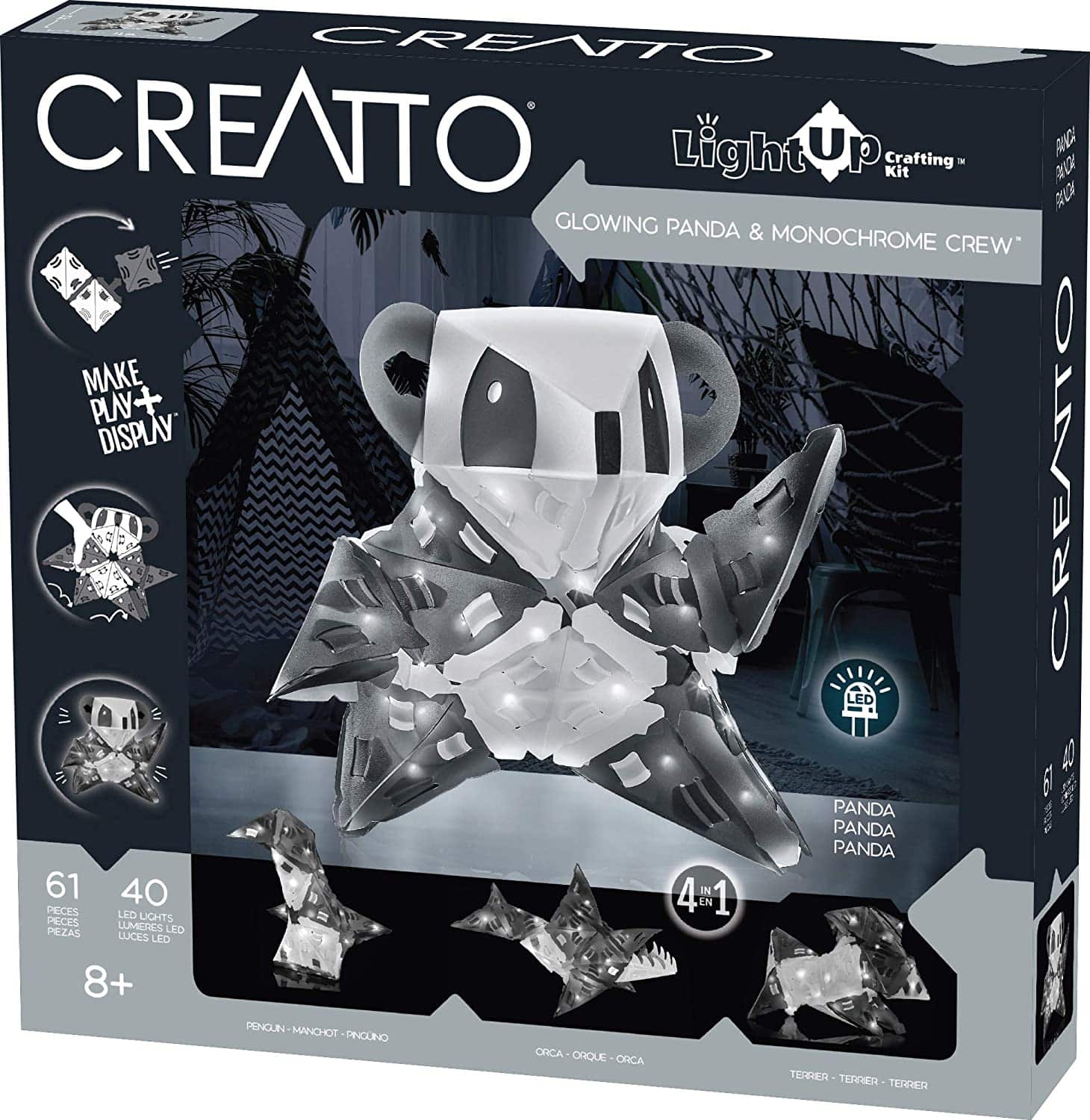 Glowing Panda & Monochrome Crew includes 61 Creatto pieces, a string of 40 LED lights, and assembly instructions to build a panda, penguin, orca whale, and terrier. Battery-powered lights require 2 AA batteries. Suitable for ages 8 and up.