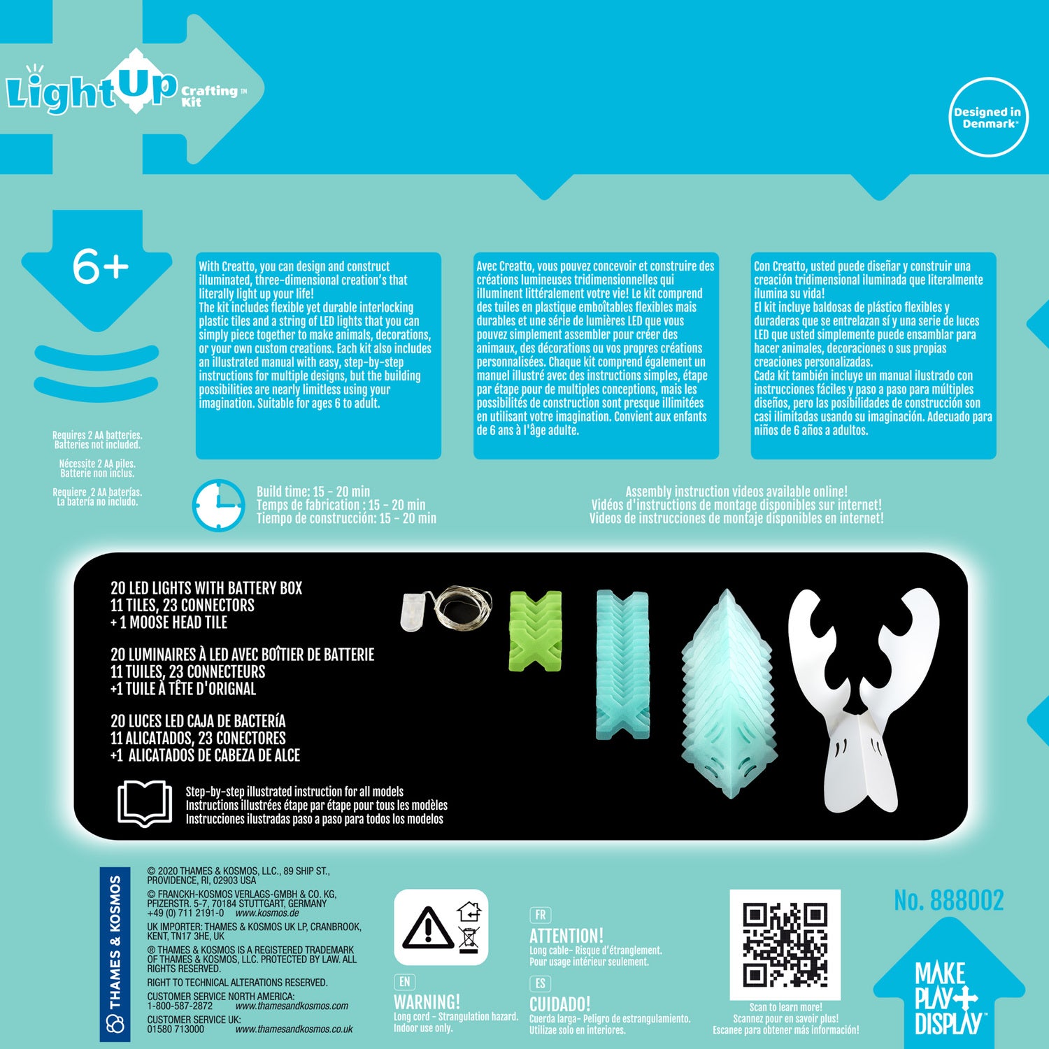 Creatto is a simple yet versatile building system that consists of just two primary components that can be woven together into countless 3D creations The flexible yet durable plastic tiles interlock quickly and easily for all skill levels no additional materials or hardware required! Magical Moose & Forest Friends includes 35 Creatto pieces and assembly instructions to build a moose beetle dinosaur and tree but the possibilities are limited only by your imagination! Add the string of 20 LED lights to illuminate your works of art from the inside out