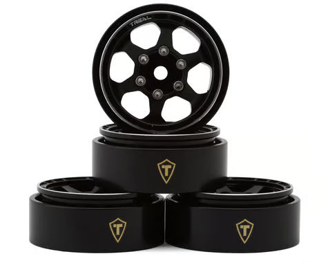 Treal Hobby Type D 1.0" Concave 6-Spoke Beadlock Wheels. Constructed from high quality CNC machined aluminum with heavy black coated brass rings, this optional Beadlock set is intended for micro rock crawlers platforms such as the TRX-4M, FCX24, Enduro24, SCX24 and AX24 to enhance durability and reliability, add 84.8g of total unsprung weight to lower the center of gravity for enhanced crawling performance and stability and give bling and style to your rig!