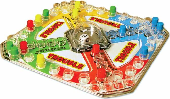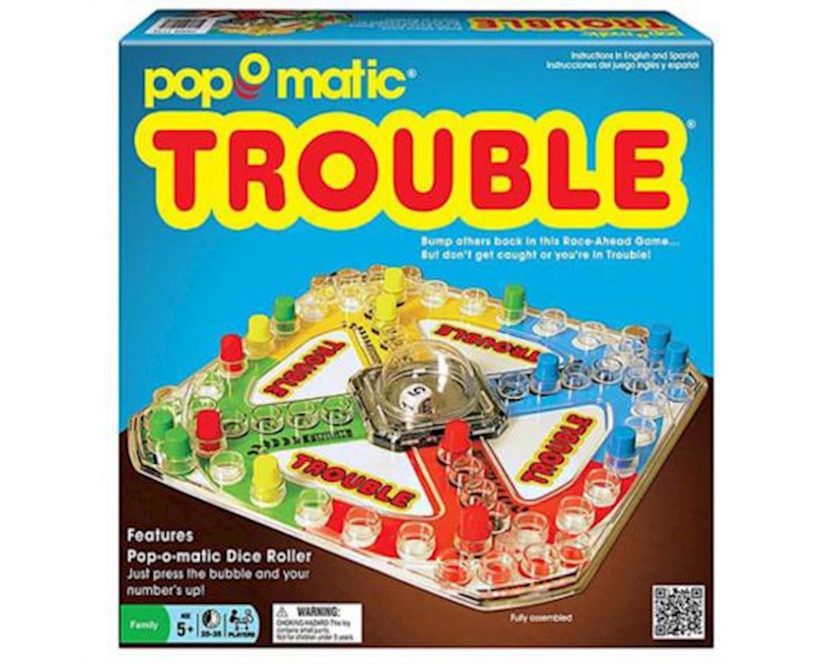 Press the Pop-o-Matic bubble on this Trouble game from Winning Moves; and the fun begins. PRODUCT FEATURES Depending on what you roll; you can move your pegs to the Start space; move your pegs forward - or watch other players move while you cant Each of your pegs has to go all the way around the board to the finish space First player with all pegs at finish wins